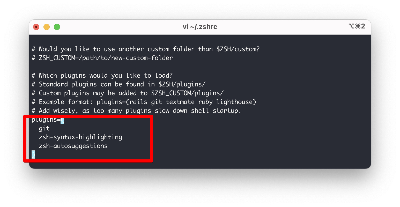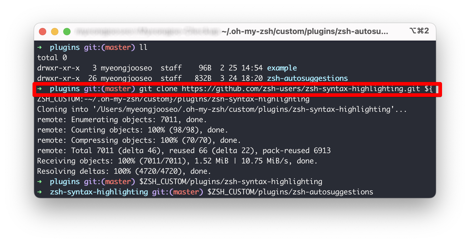 git clone https://github.com/zsh-users/zsh-syntax-highlighting.git ${ZSH_CUSTOM:-~/.oh-my-zsh/custom}/plugins/zsh-syntax-highlighting